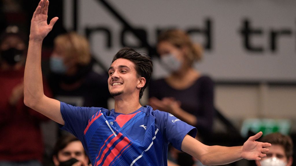 Lorenzo sonego festeja su victoria ante novak djokovic en viena.